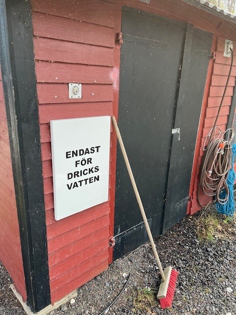 Vi har nu dricksvatten från egen borrad brunn. Vattenprov är taget med väl godkänt resultat, dock lite mer järn än vanligt. Dricksvatten finns i klubbhuset och från slang vid pumphuset bredvid betongkajen. Som tidigare slår man på vattnet med klubbnyckeln (låset ovanför skylten).